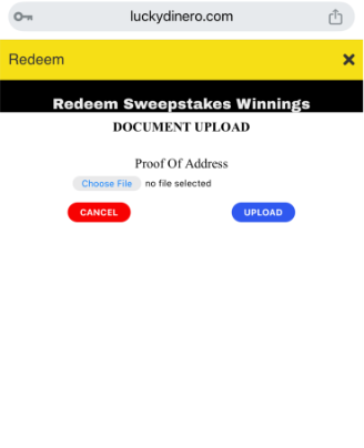Go back to menu icon from the luckydinero.com website and click REDEEM icon to verify the address (bank statement, utility bill or credit card statement from last 3 months required)